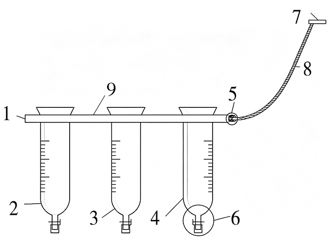 笔者设计的这种医用尿液收集装置,核心结构为安装板,安装板上沿左右方向并排开设有3个安装孔,孔内分别固定安装有前段收集管、中段收集管和末段收集管,三者自上而下对应尿液的不同阶段,实现精准分段收集。3个收集管的顶部均设计为喇叭口状结构,可有效扩大收集范围,避免尿液洒落;外表面均刻有容积刻度线,便于医务人员直接观察尿液收集量,满足检测取样的剂量要求。