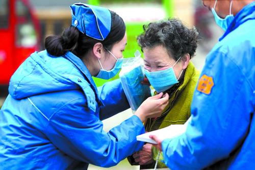 11月18日上午,郑州市航海东路社区卫生服务中心医务人员为辖区老人戴口罩。当天,郑州市空气重度污染。入冬以来,雾霾天逐渐增多,该中心医务人员随身携带口罩,在外出随访的路上,向老人、儿童等雾霾天呼吸道疾病高发人群免费发放。史 尧/摄
