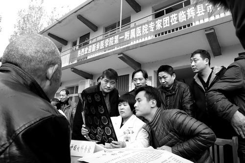 11月20日上午,新乡医学院第一附属医院医疗公益志愿服务者在辉县市高庄乡土楼村为贫困群众义诊。当天下午,该院消化科、肾病风湿科等科室的7名专家还为参加培训的50多名乡村医生进行授课,为他们讲解了最前沿的诊疗知识。尚慧彬 段桂洪/摄