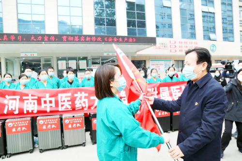 ←11月4日10时30分,河南中医药大学第一附属医院派出30名医务人员,支援郑州市第一人民医院南院区(郑州市新冠肺炎定点救治医院)。在出发仪式上,河南中医药大学第一附属医院党委书记翟剑波将院旗交到带队出发的该院儿科专家张霞手中。