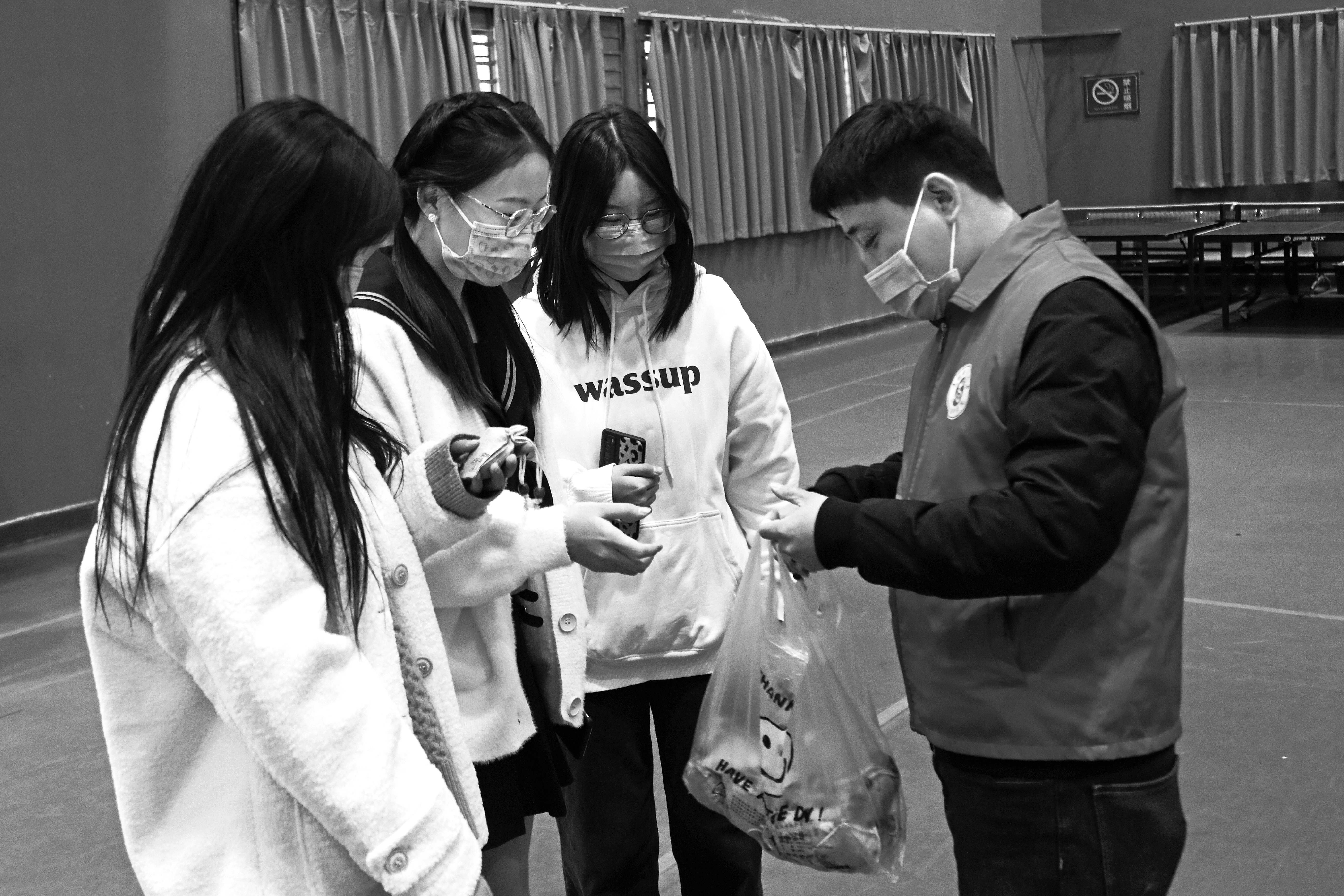 11月8日,在郑州轻工业大学核酸检测点,河南省中医院医务人员向参加核酸检测的群众现场发放辟秽祛浊香囊。 李 攀/摄