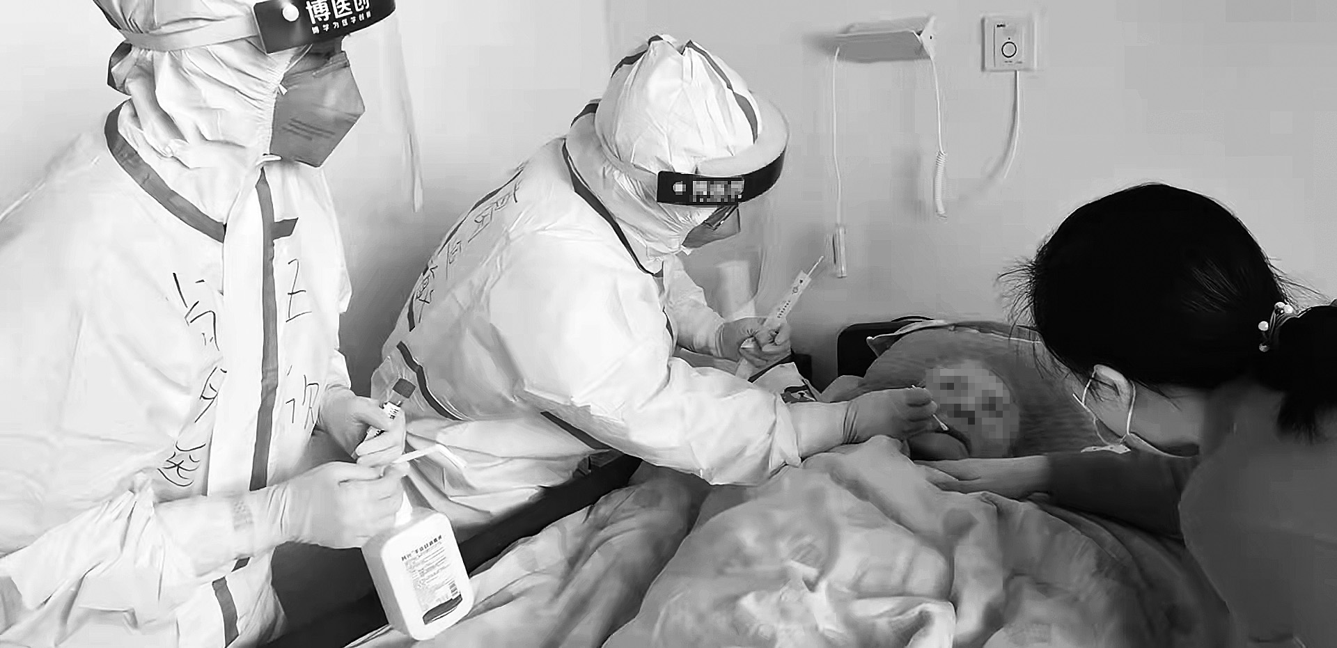 →11月11日,在首慈乐康养护中心,河南省肿瘤医院医务人员正在为97岁的赵先生采集核酸。赵先生因病无法自主张嘴,医务人员就弯着腰,探着身,找准角度,眼疾手快地完成核酸采集。 冯金灿 常 榕/摄