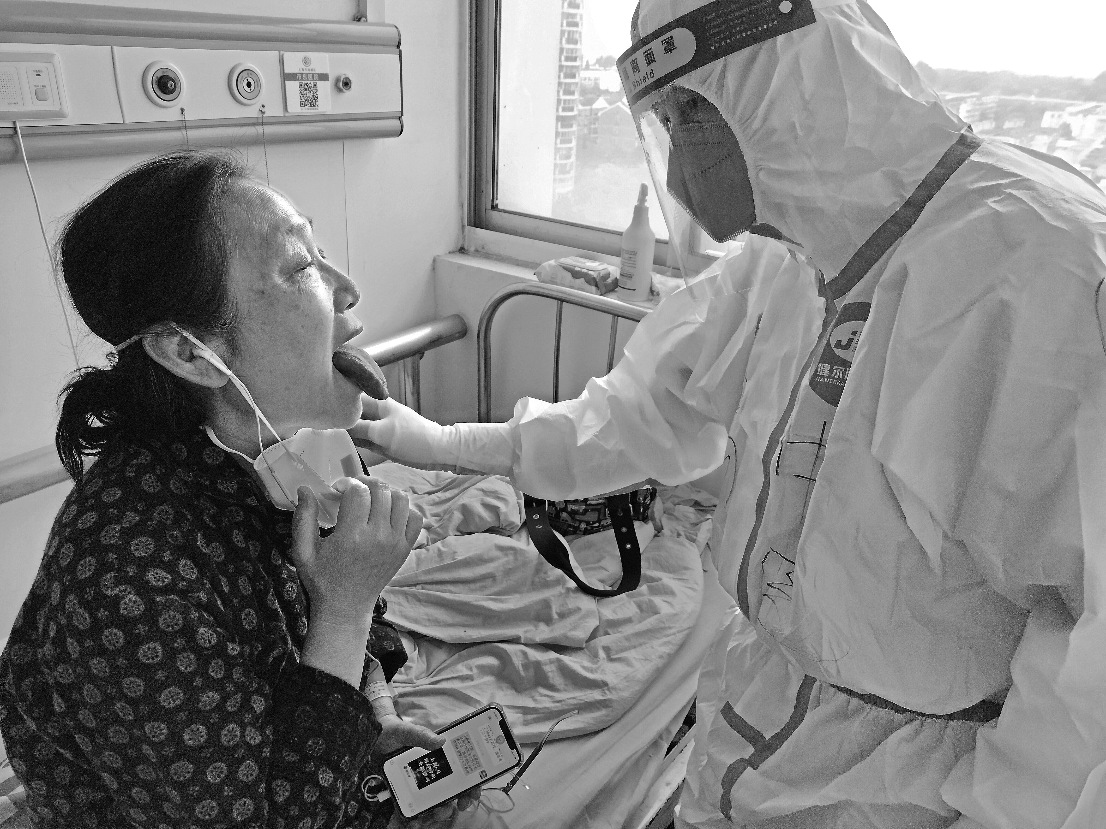 ←5月12日,在上海新冠肺炎定点救治医院杨浦区市东医院病房内,河南省人民医院援沪医疗分队医生刘豹正在为患者查看舌苔,进行辨证治疗。近期,河南援沪医疗队和当地医院中医科合作,对病区患者实现中医药治疗全覆盖。 冯金灿 陈同峰/摄