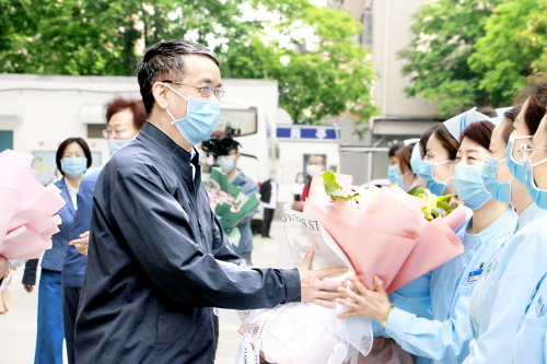 5月12日,国际护士节当天,郑州市中医院为赴郑州市第一人民医院南院区支援的医务人员送上鲜花。据了解,为充分发挥中医药在新冠肺炎疫情防控中的作用,郑州市中医院抽调40名医务人员组成医疗队,赴郑州市第一人民医院南院区支援。 丁 玲 路瑞娜/摄