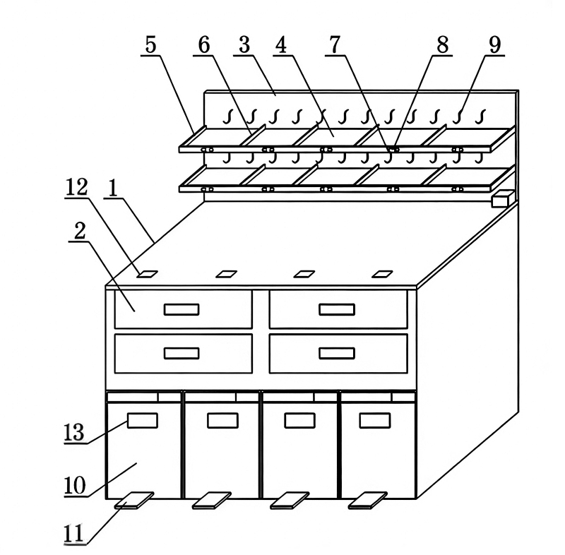 在临床护理工作中,准备环节是保障诊疗顺利开展的关键流程,涉及药液配置、治疗用品整理、医疗垃圾处理等多项操作。 设计背景 当前临床所使用的治疗设备存在诸多痛点。 储物空间布局不合理。治疗用的药液、生理盐水、安瓿等用品缺乏专用分类存放区域,易出现混淆摆放情况,不仅增加护理人员寻找物品的时间,还可能因物品错用引发医疗风险。 医疗垃圾处理不规范。现有设备多未设置专用的分类储存结构,安瓿、利器、普通医疗垃圾等常混合投放,既不符合医疗废物分类管理规范,又易导致环境污染,同时增加护理人员职业暴露的风险。 操作便捷性不足。传统垃圾柜多采用手动开合方式,护理人员在配药操作后,需要手动开关柜门投放垃圾,易造成手部污染,且频繁弯腰操作会加重腰背部负担,长期易引发职业损伤。 此外,现有设备缺乏适配的辅助配件,如液体瓶悬挂结构、患者信息标识装置等,导致护理人员需要频繁往返于治疗台与储物间之间,工作效率低下。 为解决上述临床痛点,规范治疗准备流程,提升护理工作效率,降低职业损伤与医疗风险,笔者设计了一种新型治疗准备台,通过优化结构布局、增设分类功能、改进操作方式,为临床护理工作提供更安全、高效、便捷的治疗准备解决方案。 产品结构 这种新型治疗准备台,包括操作台、4个抽屉、4个储物柜。这三大核心储物模块布局规整、取用便捷:4个抽屉均匀排布于操作台下方,4个储物柜则左右间隔设置于抽屉下方,形成分层储物结构。 使用方法 治疗用品摆放 将不同患者的药液、生理盐水、葡萄糖等治疗用品分类放置于各置物框内,通过磁扣粘贴对应患者的信息标识。该设计既能借助挡沿与挡板的防护作用避免安瓿等易碎品掉落,又能通过信息标识明确区分不同患者的用品,防止混淆;患者治疗完成后,取下磁扣即可将置物框复位重新使用。 医疗垃圾投放 配药或治疗过程中产生垃圾时,根据操作台的垃圾标记,踩下对应储物柜的脚踏板,柜门自动翻转打开,将垃圾投放至收集袋后松开脚踏板,柜门在阻尼铰链的缓冲作用与复位弹簧的拉力作用下平稳闭合。 收集袋更换 当观察到收集袋内垃圾装满后,踩下脚踏板打开柜门,通过收紧绳与收紧扣将收集袋封口,取出旧收集袋后,将新收集袋套设置于支撑圈并整理固定,完成更换。 创新优势与实用价值 这种新型治疗准备台设计科学合理、配套设施齐全,具备显著的科技创新性与实用价值:其一,创新增设医疗废物分类储存柜,实现安瓿、利器等不同类型医疗垃圾的彻底分类收纳,有效降低环境污染风险,减少医务人员的职业暴露风险;其二,优化储物空间布局,通过抽屉、置物框、挂钩等多元化储物结构,为治疗用物提供充足的储存空间,减少护理人员往返取物的频次,大幅提升工作效率;其三,采用脚踏式自动开关装置,无须手动接触柜门即可完成开合操作,同时减少护理人员弯腰投放垃圾的动作,降低腰背部职业损伤的发生概率,更贴合临床护理的实操需求。