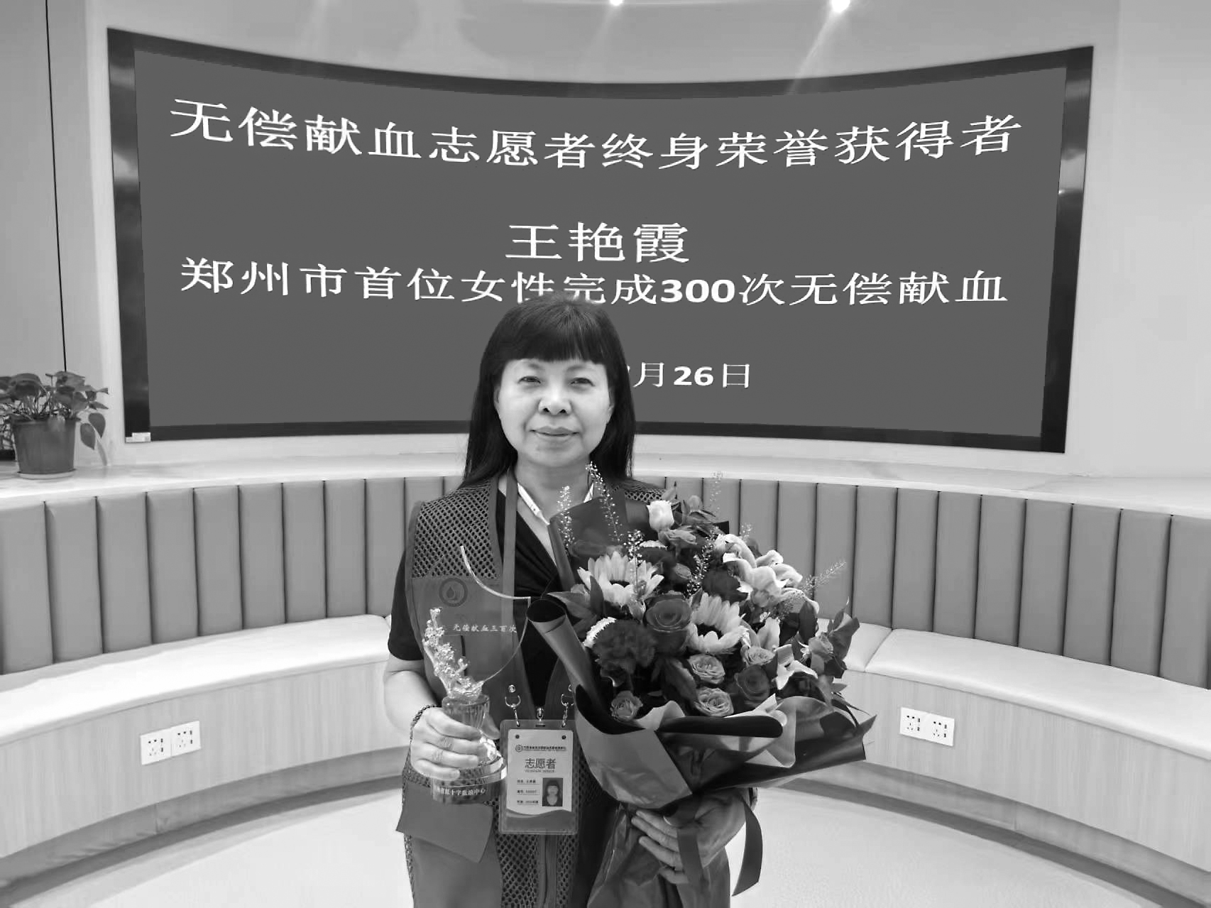 “我不认识你,但我谢谢你。”这是无偿献血宣传中常见的一句话。无数无偿献血者,维系着千家万户的团圆与幸福。 近日,河南省红十字血液中心一楼大厅迎来了一位特殊的客人——郑州市首位300次女性献血者王艳霞(如图)。这位看似普通的女性,用她独特的“红色印记”书写着不平凡的人生篇章。从第一次挽起袖子时的紧张忐忑,到如今完成300次献血时的从容坚定,她的血管里流淌着比血液更珍贵的奉献精神。 在郑州市无偿献血志愿者队伍中,提及王艳霞的名字,无人不肃然起敬。24年来,她坚持无偿献血300次,以实际行动诠释着全市无偿献血“女状元”的飒爽英姿。 王艳霞是河南省残疾人康复服务中心的一名普通职工。自2002年7月15日首次参加无偿献血以来,24年间她从未间断。300张无偿献血证、多张全国无偿献血奉献奖表彰证书,都是她爱心的见证。为了能够成功捐献血液,她一直严格要求自己的饮食和作息,献血前坚决不吃油腻食物、不熬夜、不饮酒,她笑称自己是“免检产品”。 更令人钦佩的是,王艳霞2006年加入中华骨髓库,2022年成为遗体器官捐献志愿者。除了坚持定期献血,她还积极带动身边的人参与无偿献血。她的儿子刚满18岁就主动加入了无偿献血者的队伍,同事、朋友以及被她动员的路人也相继加入无偿献血者队伍,其中一些人还成为无偿献血志愿者。 作为河南省省会无偿献血志愿者服务队拓展部部长的王艳霞,从事无偿献血志愿服务已逾十载,累计服务时长达9450小时。她的志愿服务内容包括指导献血者填写无偿献血登记表、讲解无偿献血知识等。此外,她还主动向献血者讲述自己的献血故事,许多献血者从她的故事中汲取了勇敢与力量,更加坚定了拯救生命的决心。 当被问及为何能坚持无偿献血这么久时,王艳霞说:“或许是缘分吧。公益这条路一旦踏上,就不想停下脚步。‘人人为我,我为人人’,社会正是在这样的互助中不断进步,我们的生活也才能因此越来越美好。”未来,她仍会继续在无偿献血这条路上前行,在志愿服务中持续行动,希望有越来越多的人加入无偿献血的行列,为患者点亮一盏希望之灯,为无数家庭带去生命的曙光。 多年来,王艳霞以真挚的情感、无私的爱心托举生命之梦,用实际行动诠释着人间大爱。截至目前,王艳霞先后多次获得全国无偿献血金奖、全国无偿献血奉献奖终身荣誉奖、全国无偿献血志愿服务终身荣誉奖等荣誉。 河南省红十字血液中心光荣榜记录着王艳霞的献血次数,而那些因她捐献的血液而重获新生的生命,才是她最好的勋章。从100次到200次的献血,是热血滚烫;从200次到300次的献血,是爱意沸腾!王艳霞用热血展现巾帼力量,用志愿服务描绘青春芳华。