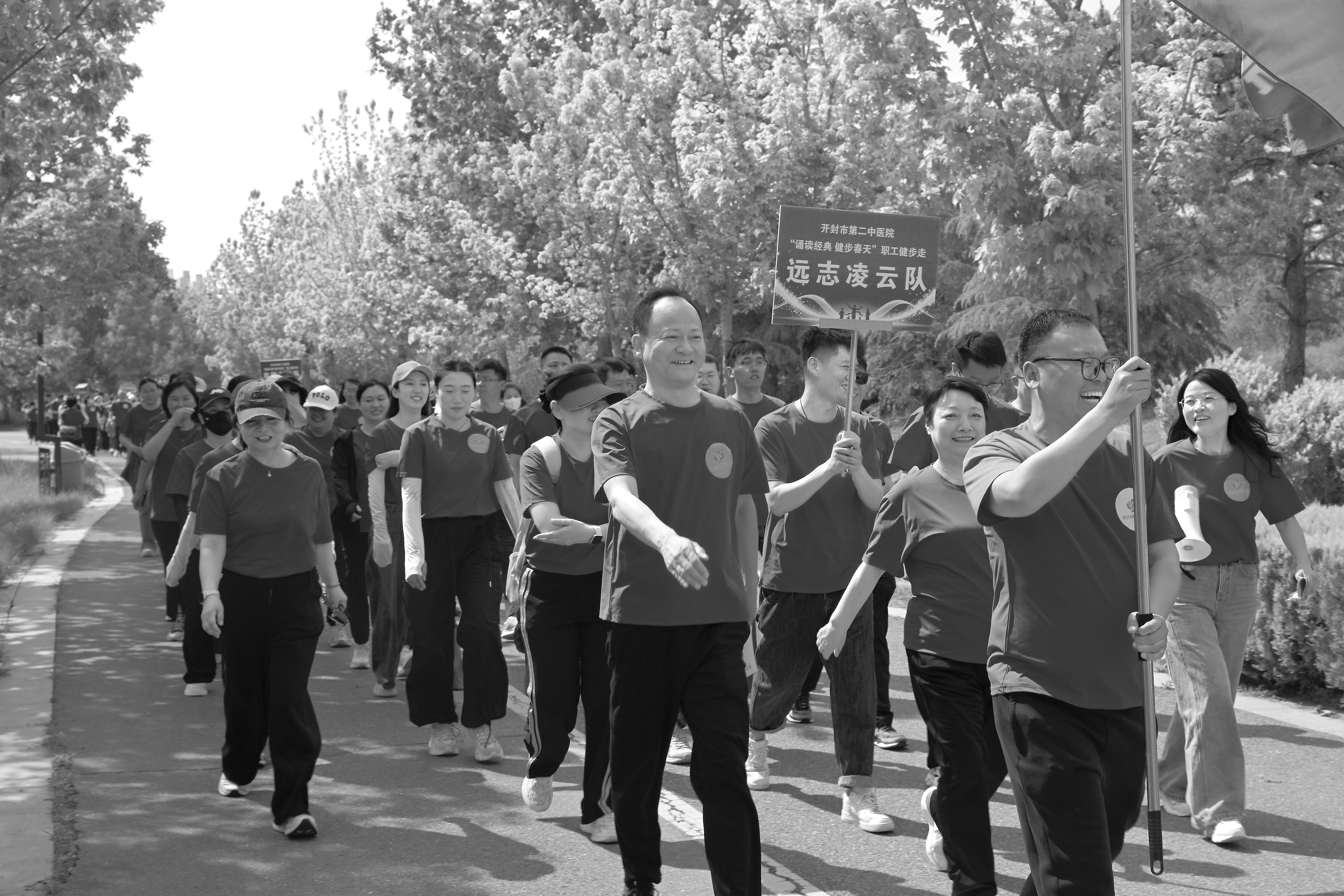 ↑4月24日,在开封市西湖,市第二中医院职工正在健步走。当天,该院首届“诵读经典 健步春天”职工健步走活动举行。此次活动丰富了全院职工的业余生活,充分展现了全院职工团结协作、昂扬向上的精神风貌,让大家在忙碌的工作之余放松身心。 张治平 王志彦/摄